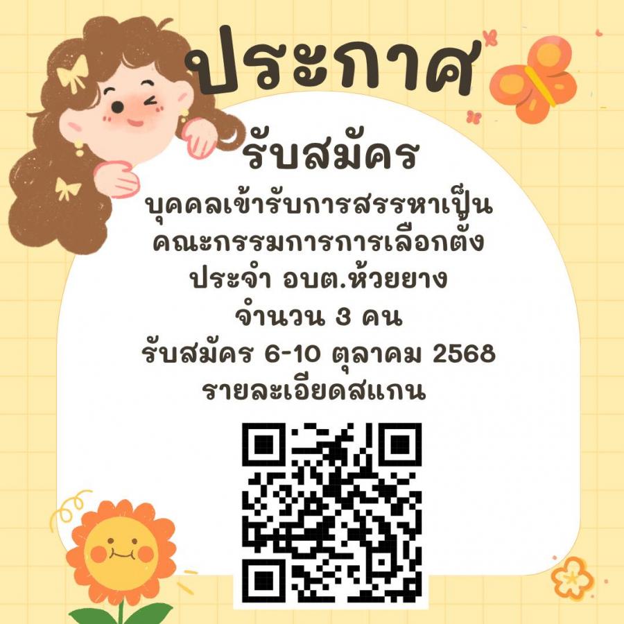 ประกาศ รับสมัครบุคคลเข้ารับการสรรหาเป็นคณะกรรมการการเลือกตั้งประจำ อบต.ห้วยยาง จำนวน 3 คน รับสมัคร 6-10 ตุลาคม 2568