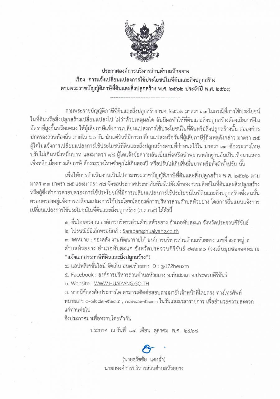 การแจ้งเปลี่ยนแปลงการใช้ประโยชน์ในที่ดินและสิ่งปลูกสร้างตามพระราชบัญญัติภาษีที่ดินและสิ่งปลูกสร้าง พ.ศ.2562 ประจำปี พ.ศ.2569